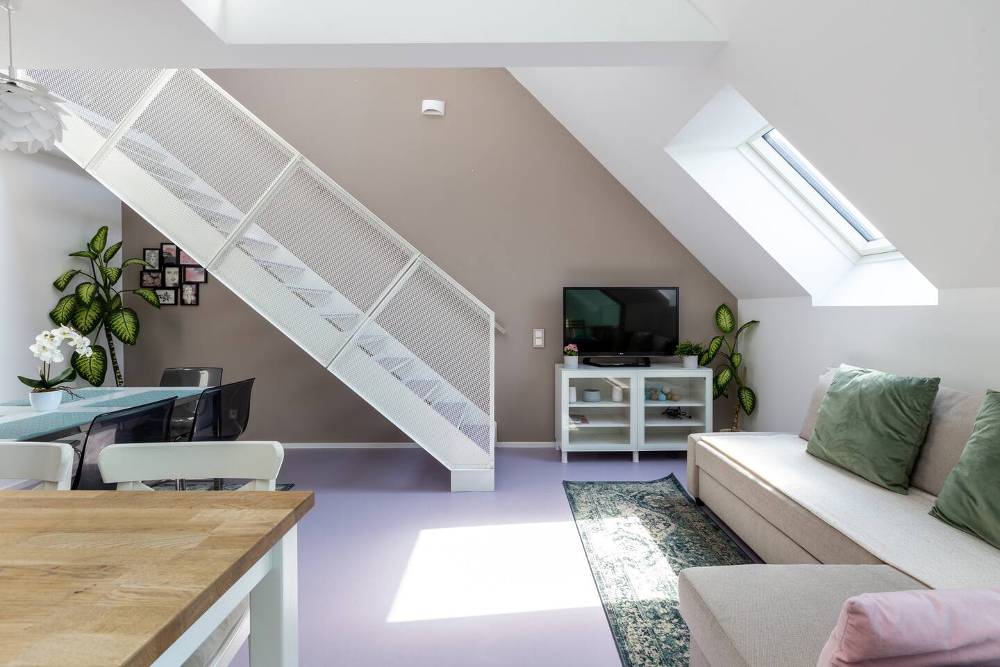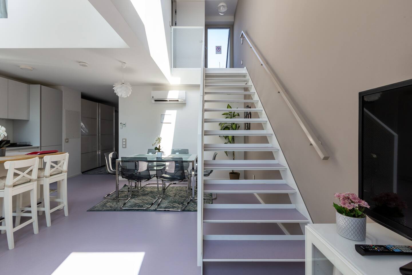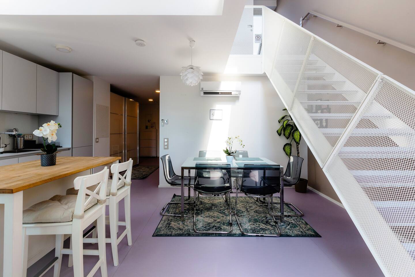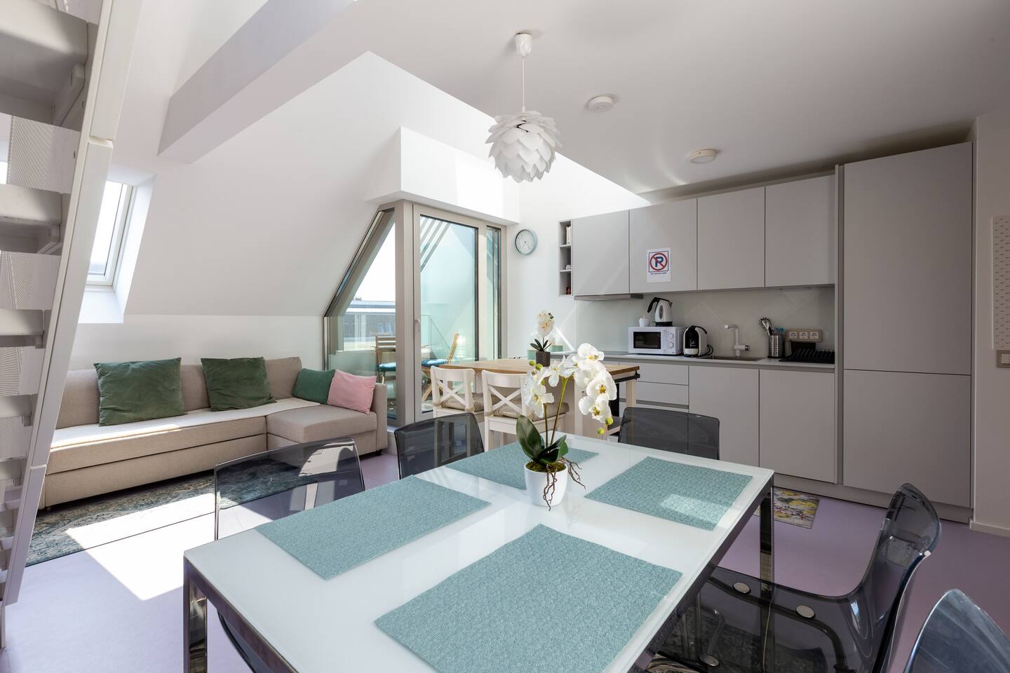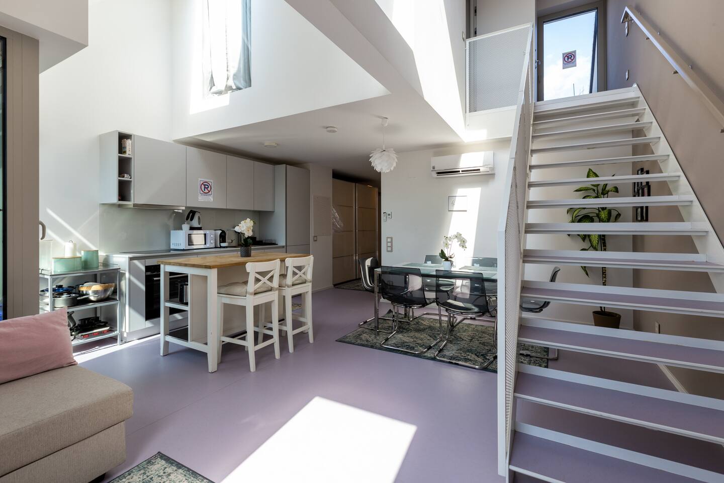 Bright and open space living room with a high end kitchen and all amenities needed. Living room contains a very comfortable sofa bed for 2 people. One of two terraces is at the living room. Upstairs is a second, even bigger terrace. The apartment has two master bedrooms. Upstairs at gallery is another sofa bed for two people. To protect the environment and respect the neighborhood, parties are not allowed in the apartment. We have a DB system in the apartment and video surveillance in the corridors (outside the apartment).