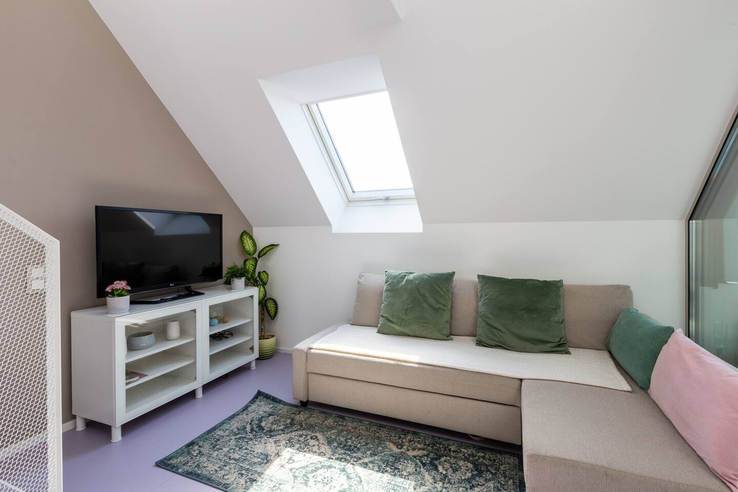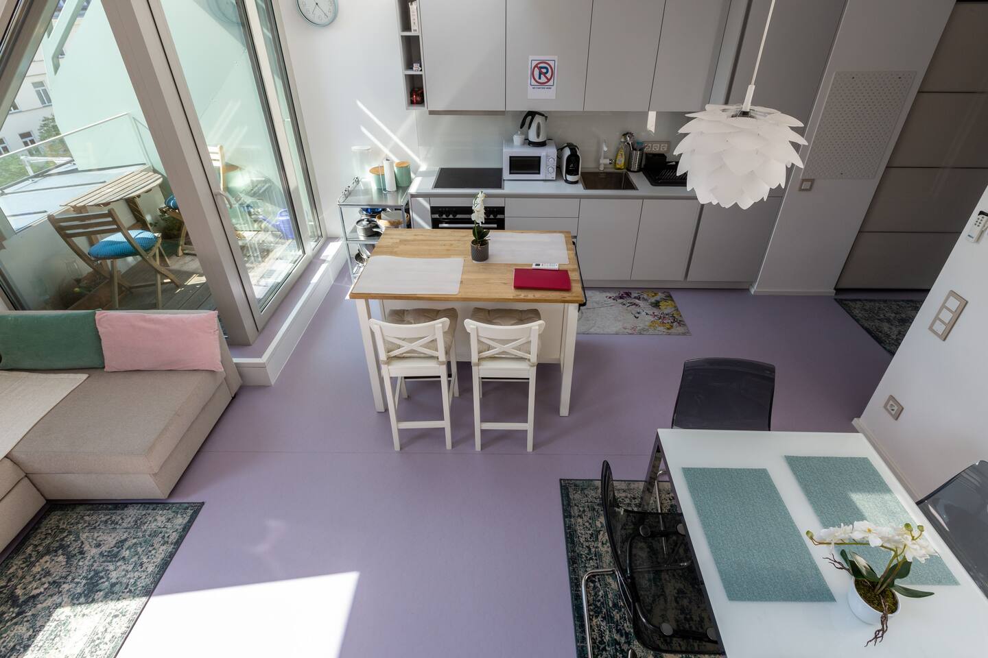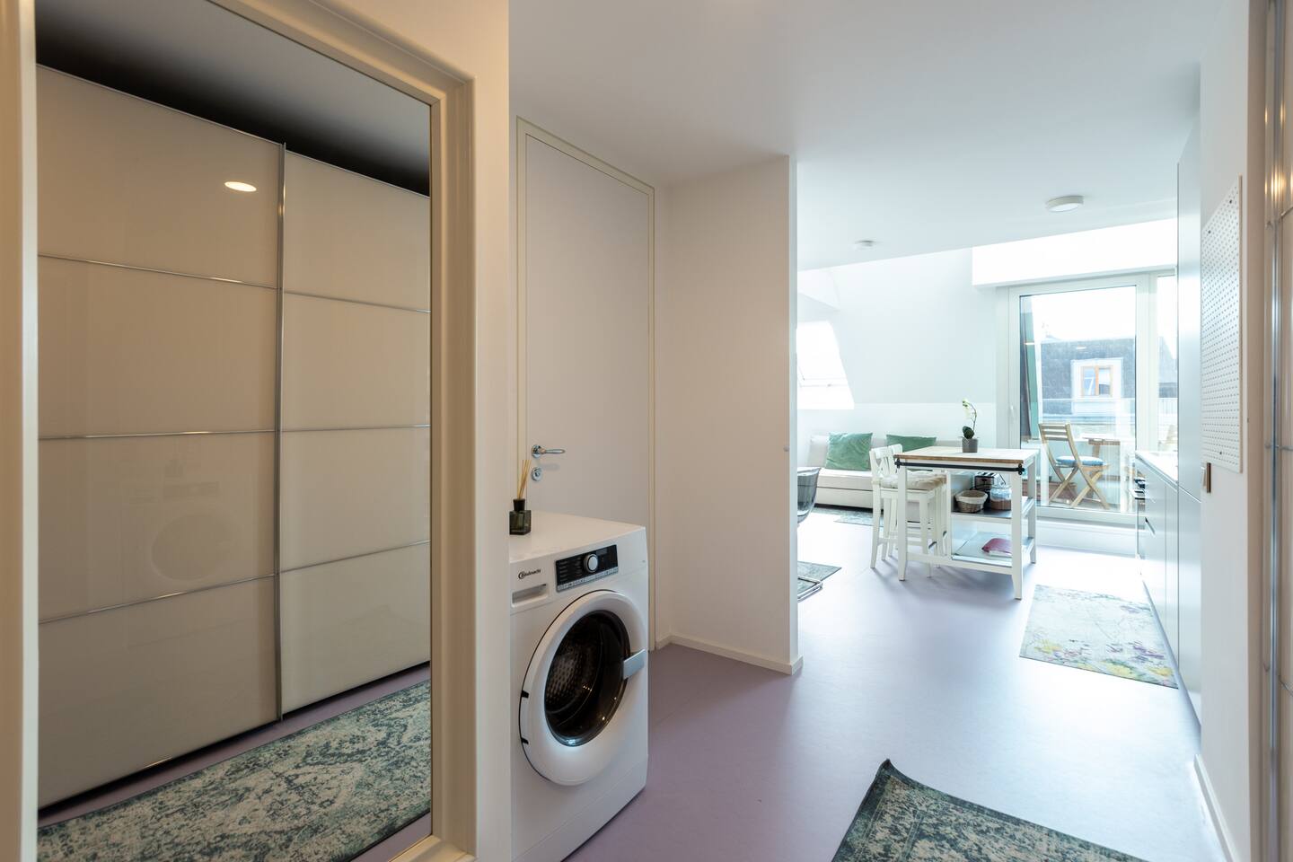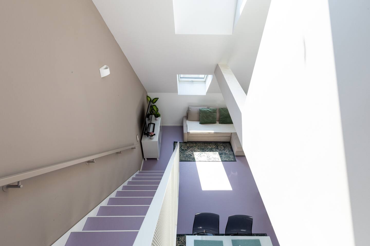 Bright and open space living room with a high end kitchen and all amenities needed. Living room contains a very comfortable sofa bed for 2 people. One of two terraces is at the living room. Upstairs is a second, even bigger terrace. The apartment has two master bedrooms. Upstairs at gallery is another sofa bed for two people. To protect the environment and respect the neighborhood, parties are not allowed in the apartment. We have a DB system in the apartment and video surveillance in the corridors (outside the apartment).